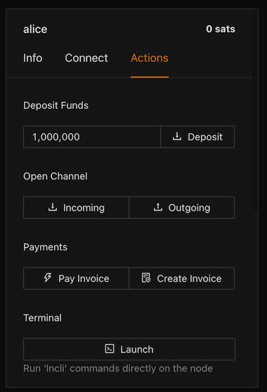 下一步是在 Alice 和 Bob 之间创建一条通道,用来进行闪电付款。点击 Alice 的节点,右侧控制面板会显示我们可以与该节点交互的不同方式。点击 “Actions(操作)” ,我们就会看到向 Alice 的钱包充值模拟比特币以及在 Alice 和 Bob 之间开启通道所需的一切工具。接下来,我们先向 Alice 的钱包充值一些资金,再开启 Alice 与 Bob 的通道吧。